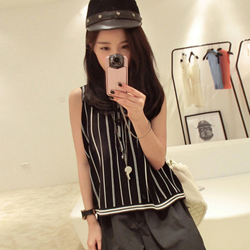 文藝范針織背心2016春夏新品薄款寬松無袖黑白條紋百搭針織衫3367 /