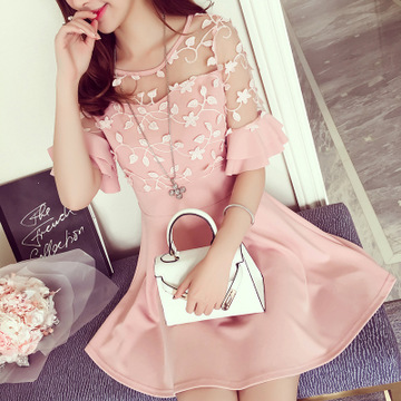 俏格調(diào)2106新款淑女蕾絲拼接透視荷葉袖連衣裙收腰氣質(zhì)a字裙 /