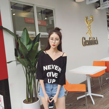 甜美V領(lǐng)露肩印花女裝T恤衫吊帶韓范款式百搭女裝上衣潮 /