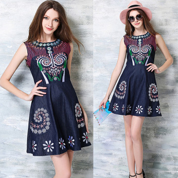 2016歐洲站春夏新款時(shí)尚收腰復(fù)古刺繡牛仔連衣裙背心裙短裙女裝潮 /