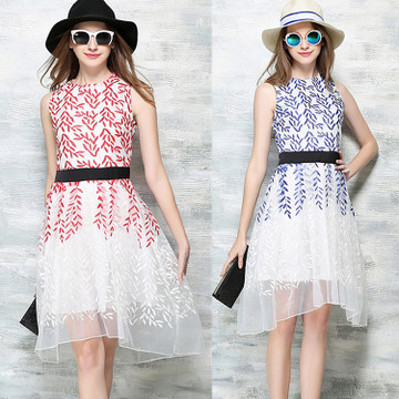 實(shí)拍2016夏季新品時(shí)尚刺繡歐根紗 顯高修身無袖中長款連衣裙女裝 /