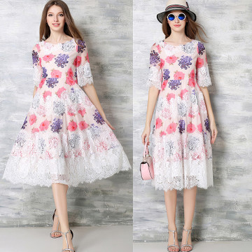 實(shí)拍2016夏季新品 雪紡印花蕾絲花邊沙灘長裙大擺中腰連衣裙女裝 /
