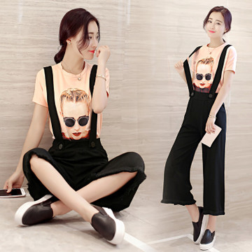 2016夏季短袖T恤闊腿褲套裝女夏裝休閑時(shí)尚背帶褲9分褲兩件套潮 /