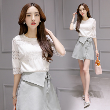 2016夏裝新款休閑女裝韓版套裝修身七分袖蕾絲上衣+時(shí)尚短裙潮 /