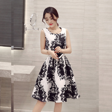 新款夏裝女韓版名媛風水墨印花修身無袖背心裙打底連衣裙 /