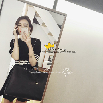 歐美走秀同款歐洲站2016夏裝新款時尚拼接修身收腰A字裙連衣裙女 /