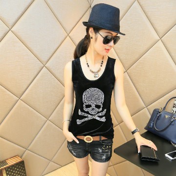 新款韓版金絲絨網(wǎng)紗圓領(lǐng)燙鉆骷髏顯瘦背心女無袖t恤打底 /