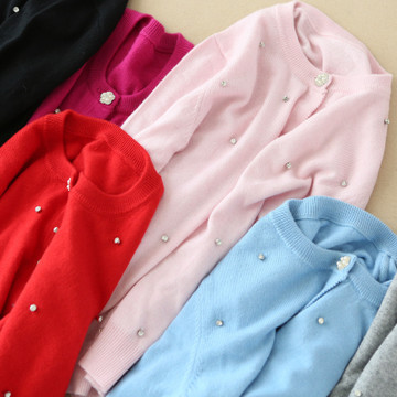 歐美范2016春裝新款歐洲站名媛水鉆裝飾短款珍珠扣針織開衫女外套 /