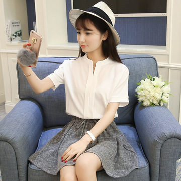 實(shí)拍 現(xiàn)貨2016韓版女裝夏裝新款短袖格子拼接連衣裙 /