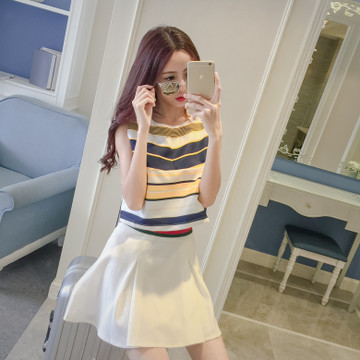 2016夏季新款女裝時尚條紋后背系帶背心裙子兩件套裝 /