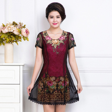 實(shí)拍 中老年女裝夏裝蕾絲網(wǎng)紗寬松大碼短袖媽媽裝中年連衣裙# /