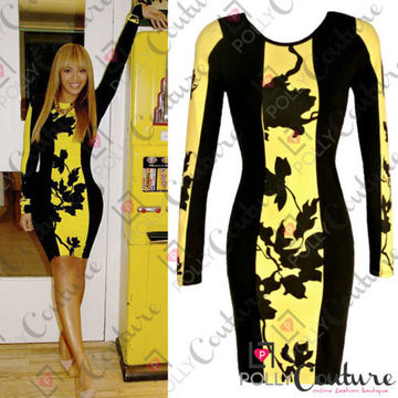 歐美大牌黃色印花簡(jiǎn)潔大方修身包臀鉛筆裙明星同款長(zhǎng)袖連衣 /