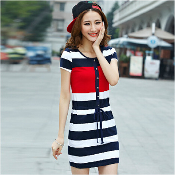 2016夏新款女裝條紋撞色連帽連衣裙時(shí)尚短袖休閑女裙修身中裙潮 /