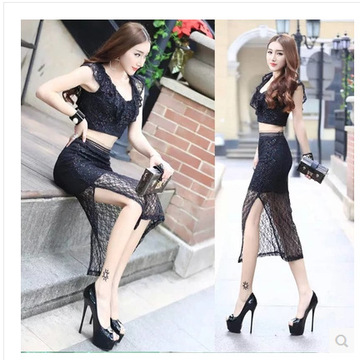 2016夏裝新款韓版性感V領(lǐng)荷葉邊露肩修身顯瘦蕾絲連衣裙套裝 /