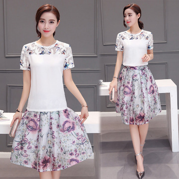 品牌直銷實(shí)拍夏季新款韓版兩件套連衣裙 時(shí)尚歐根紗蕾絲短袖套裝 /