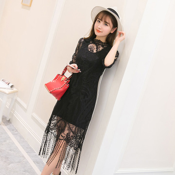 實(shí)拍 2016春夏新款韓版修身中長(zhǎng)款中袖蕾絲鏤空連衣裙套裝 /