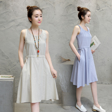 2016夏季新款文藝復(fù)古中長款棉麻連衣裙女簡約氣質(zhì)純色背心裙子 /