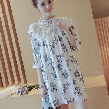 2016韓版新款夏裝蕾絲拼接七分袖印花連衣裙胖mm大碼裝 /