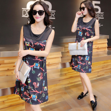 柯可佳女裝2016春夏新款大碼女裝 胖MM修身無(wú)袖印花背心裙連衣裙實(shí)拍 /