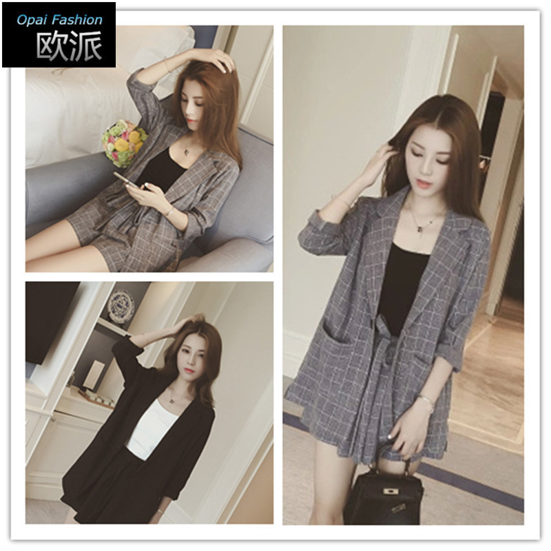 歐派 歐洲站 秋季套裝女 格子九分袖一字扣小西裝外套+松緊腰短褲 /