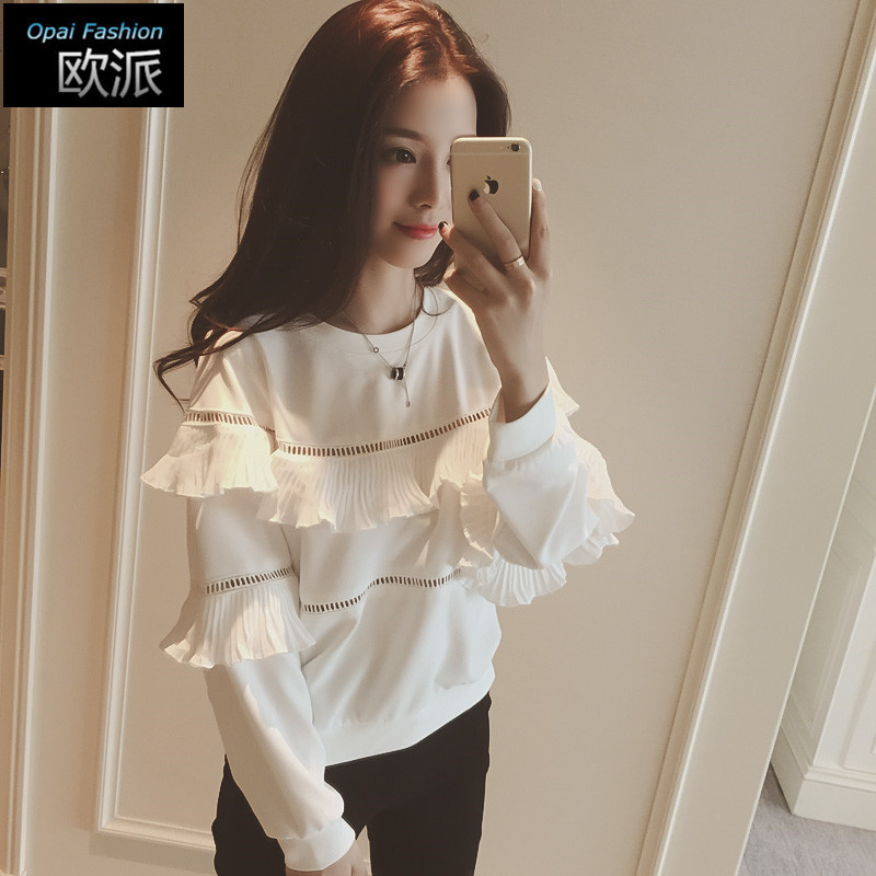 2015韓國(guó)東大門女裝秋 甜美鏤空層層木耳花邊圓領(lǐng)長(zhǎng)袖寬松上衣 /
