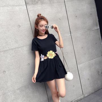 韓版寬松顯瘦圓領(lǐng)高腰鏤空太陽花連衣裙A字短裙連衣裙女夏 /
