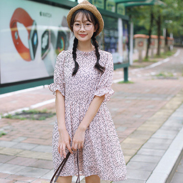 中袖圓領(lǐng)套頭中長裙小清新碎花連衣裙學(xué)生女代發(fā) /