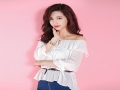 夏新款時(shí)尚甜美百搭一字領(lǐng)純色褶皺寬松套頭上衣七分袖襯衫女 /