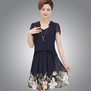 批發(fā)雪紡媽媽裝印花雙層高腰短袖連衣裙中年女裝韓版修身裙中長款 /