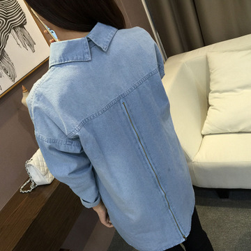 絲雨女裝寬松長袖開扣襯衫歐美風后背拉鏈翻領(lǐng)牛仔上 /