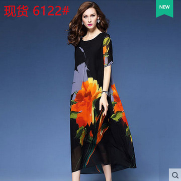 現(xiàn)貨夏裝新款女裝印花中長款連衣裙寬松桑蠶絲裙 /