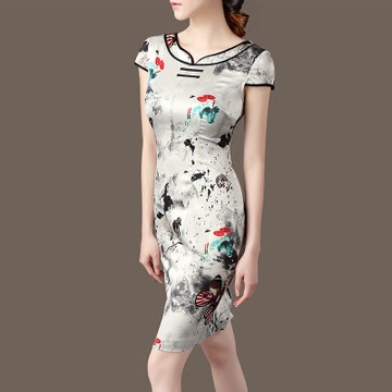 夏裝新款桑蠶絲連衣裙中長款修身旗袍大擺印花真絲連衣長裙 /