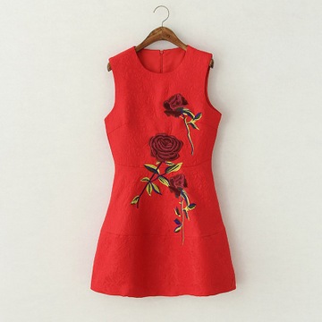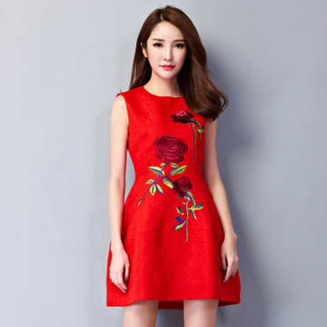 • 春季新款歐美名媛玫瑰繡花收腰修身A字大碼背心裙紅色小禮服 /