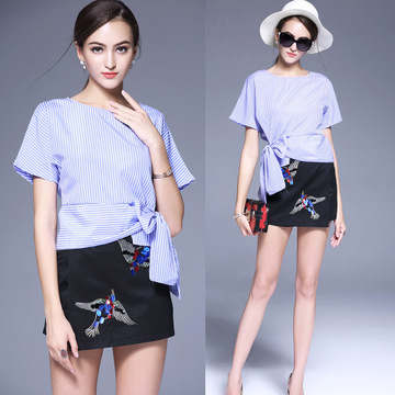 • 實拍#藍(lán)白條紋蝴蝶結(jié)系帶襯衫+刺繡亮片短褲裙套裝 /