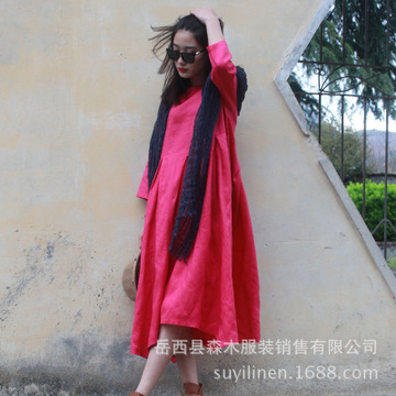 綻放696朵/鴻歌/原創(chuàng)純亞麻長裙長袖寬松休閑文藝連衣裙夏中長款 /