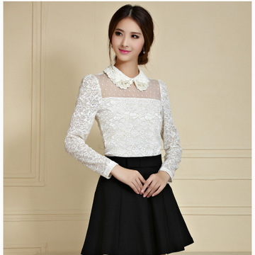 春秋款修身長袖娃娃領(lǐng)蕾絲打底衫 翻領(lǐng)女士小衫蕾絲上衣 /