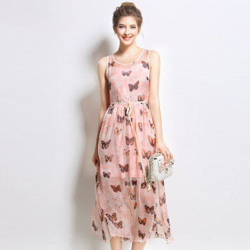 春夏季新款歐洲站時尚蝴蝶印花長裙修身淑女氣質(zhì)連衣裙 /