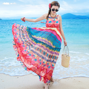 春夏波西米亞雪紡連衣裙顯瘦海邊大擺掛脖長裙度假沙灘裙 /