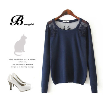 春夏新款歐美蕾絲拼接長袖圓領百搭羊絨款純色修身打底衫女 /