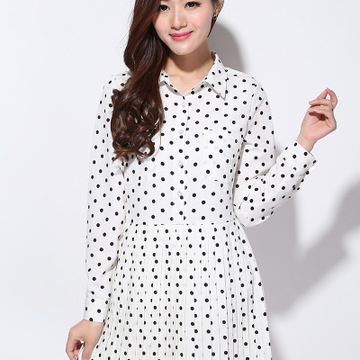 春裝新款女裝潮 波點(diǎn)百褶打底裙春秋中長(zhǎng)款修身長(zhǎng)袖連衣裙女 /