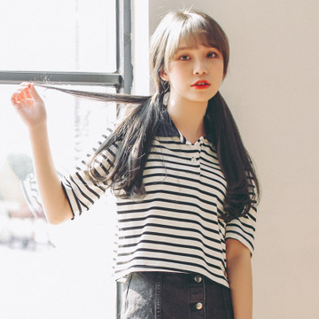 模特實拍 夏裝新款學院風條紋翻領T恤上衣 /
