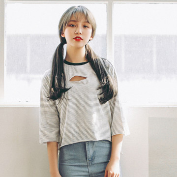 模特實拍 夏裝新款韓版寬松條紋破洞T恤上衣 /