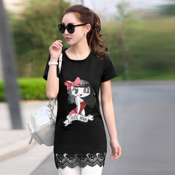 實(shí)拍夏季女裝韓版下擺蕾絲修身中長(zhǎng)款全棉T恤短袖 /