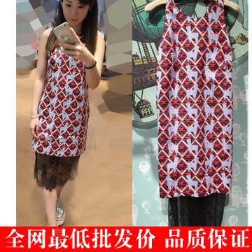 現(xiàn)貨夏裝新款時(shí)尚幾何動(dòng)物印花中長(zhǎng)款吊帶拼接蕾絲下擺連衣裙 /