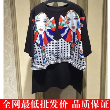 現(xiàn)貨夏裝新款卡通美女印花不規(guī)則下擺圓領(lǐng)短袖寬松T恤上衣女 /