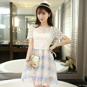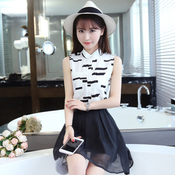 夏裝小清新短袖上衣女 吊帶連衣裙歐根紗兩件套裙 /