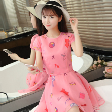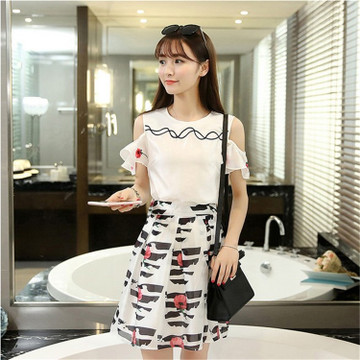 夏裝甜美露肩雪紡衫兩件套印花短裙套裝裙 /
