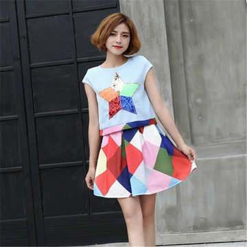 女裝夏季五角星連衣裙兩件套裙學(xué)院小香風(fēng)珠片繡半身裙短裙女 /