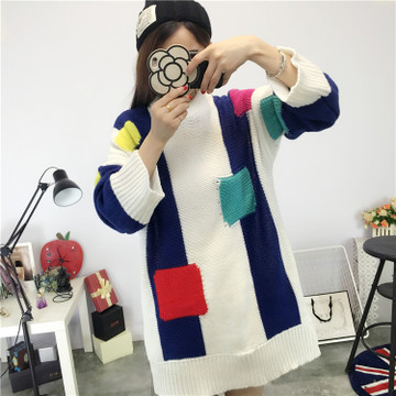 毛衣女秋冬韓版時(shí)尚拼色圓領(lǐng)套頭針織衫中長款寬松大碼毛線連衣裙 /