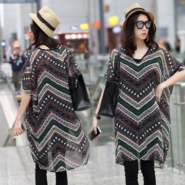 200斤胖MM寬松大碼女裝民族風(fēng)印花雪紡兩件套連衣裙女 /